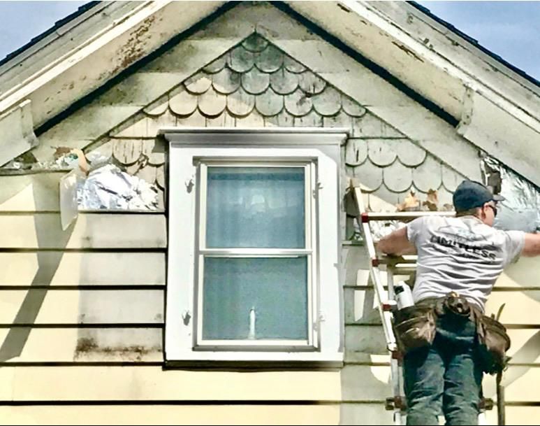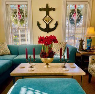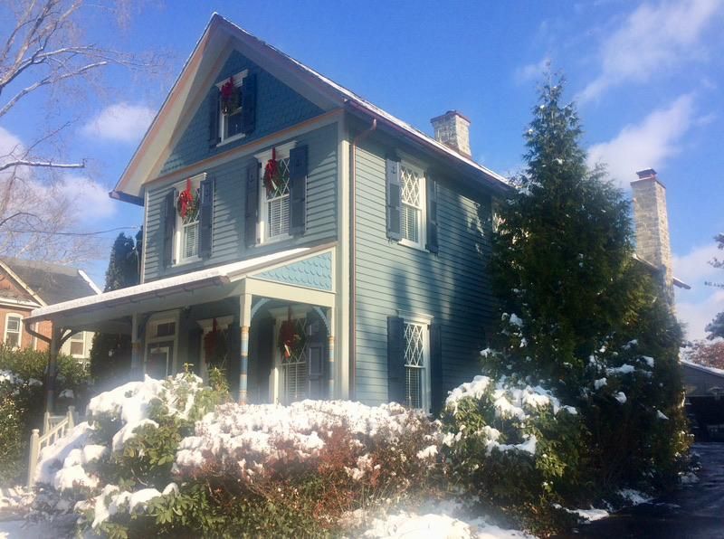 The exterior was repainted with period colors from the late 1800s. Real working Timberlane shutters were installed with a personalized anchor cutout. The original slate roof was removed years ago and is now replaced with an architectural asphalt shingle to mimic a wood-shake roof. One feature that stands out is the 17 light diamond pane windows that grace the home's exterior, enhanced by a rectangular split two-pane glass transom window above the front door that local artist Ilia Barger hand stenciled No. 68 using gold leaf paint.