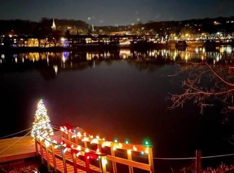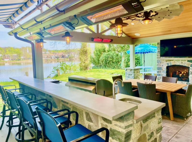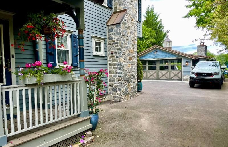Stone aggregate was mixed into the tinted grey cement for the new sidewalk and walkways to be consistent with historic guidelines. A rear detached cinderblock two-car garage circa 1950 has been renovated using the original home's exterior trim and stone foundation and is graced with an illuminated octagon cupola. A matching rear carriage house door has been added to the garage and when both doors are open the river view, once blocked, can now be seen from the first-floor den windows. It is now reminiscent of a boathouse. A covered patio connected to the garage includes an outdoor gas fireplace and kitchen. A gangway leads to a new dock along the Delaware River. The prior owners presented a horseshoe that they had found buried in the rear yard, perhaps offering good luck to the new owners.
