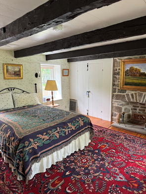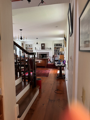 The date of the initial construction of Northwood has been estimated to be 1730-1740, with an addition dated to about 1763. The central part of the home is the oldest and initially consisted of a single room on each of four levels: first floor, second floor, attic and dirt floor basement. Acreage was sold over the generations for the sand pit, the canal, the railroad, and housing on North Main Street. Starting in the 1930’s the school district obtained ownership of successive pieces of Northwood Farm through purchase and eminent domain. This culminated in 1996, when the School District acquired all but 12 acres of the remaining farm including the farmhouse. The structure of Northwood was largely unchanged since the 18th century and did not meet code for school purposes, so the school allowed the Rhoads to buy the house back for $1.00 with the proviso that they move it to their remaining 12-acre parcel. That move occurred in 2002, and after 4 years of renovation, George and Frances moved into the home. Modern frame additions were built on the west and south sides of the house, and the interior of the house was reconfigured to replace the original spiral stairs with a modern staircase. The colonial fireplace was retained, and now houses a gas-fired AGA cooker. Renovations exposed a small additional fireplace in the bedroom above the kitchen.