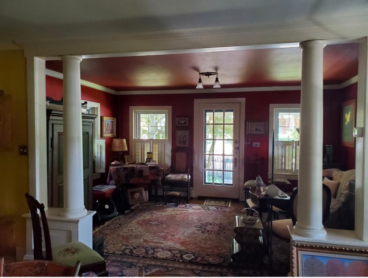 It is somewhat similar in style to other Victorian homes on North Main Street. However, it was built approximately 30-40 years later than those Stick-style homes with different features. A wrap-around porch exists on two sides of this corner property and features a porch swing loved by the owner’s young grandchild. The porch was lengthened and a new addition was added to the rear of the property in 1987 resulting in the loss of a separate rear porch. The addition houses a first-floor office and an expanded second-floor master bedroom with an ensuite bathroom. Many original features still exist including wooden columns on either side of a broad entrance between the living room and dining room. Another upstairs bathroom features a soaking tub and Anaglypta thickly embossed ceiling.