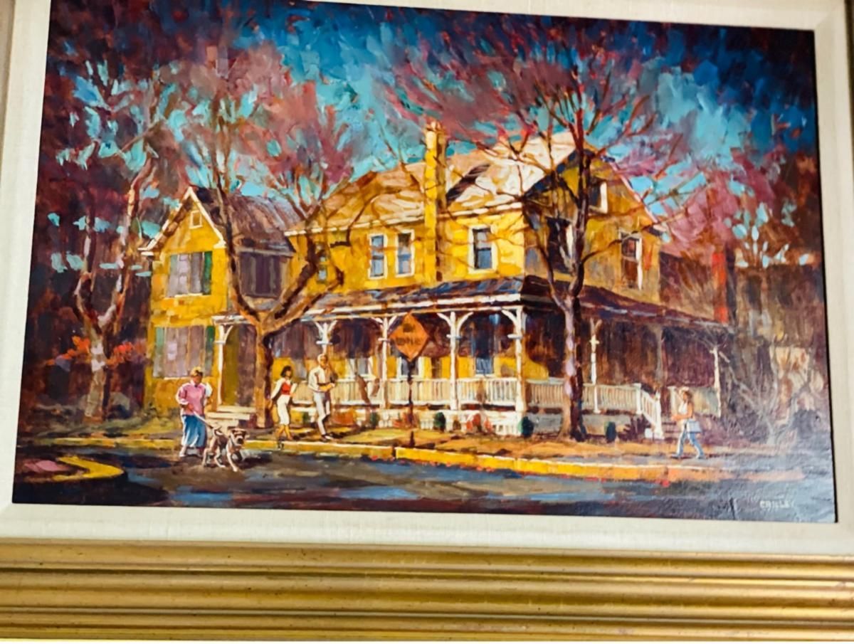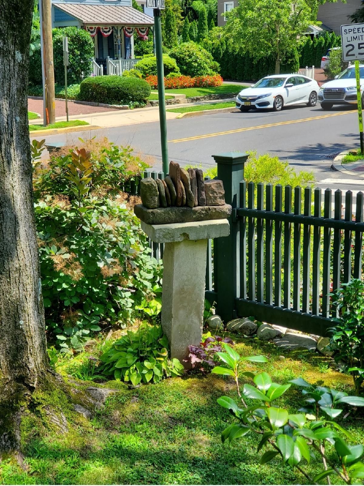 Prominent local artist Joseph Crilley’s oil painting of the home hangs in the dining room. Works by Solebury resident, Richard Zinn, also hangs on the walls. Outdoors at the corner of the front yard is a Steven Snyder sculpture consisting of several small stones sitting on a pedestal, aptly named “Library.” Bucks County woodworker of note, Phillip Lloyd Powell, lived next door and kept Ms. Baker supplied with tools.